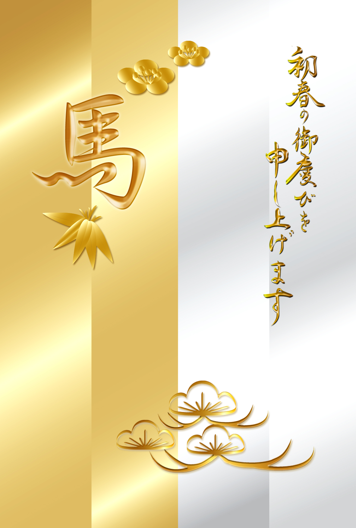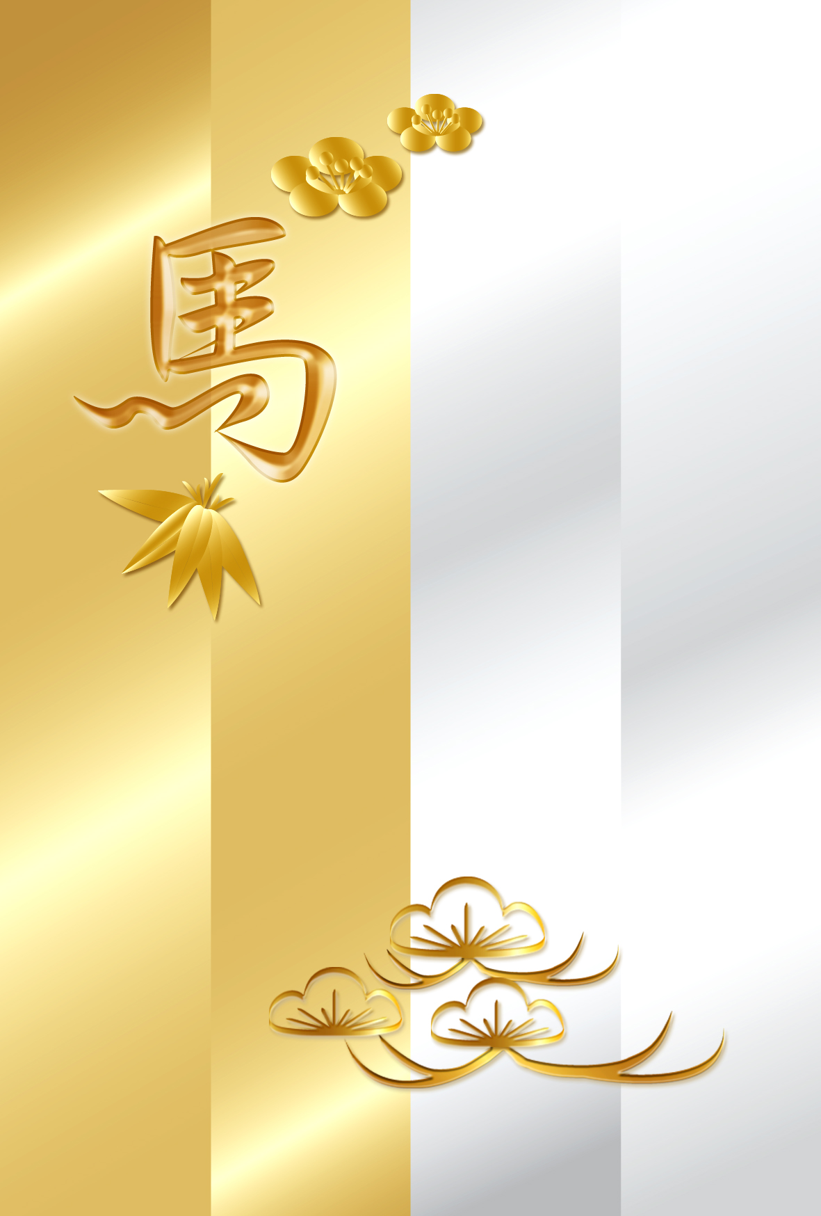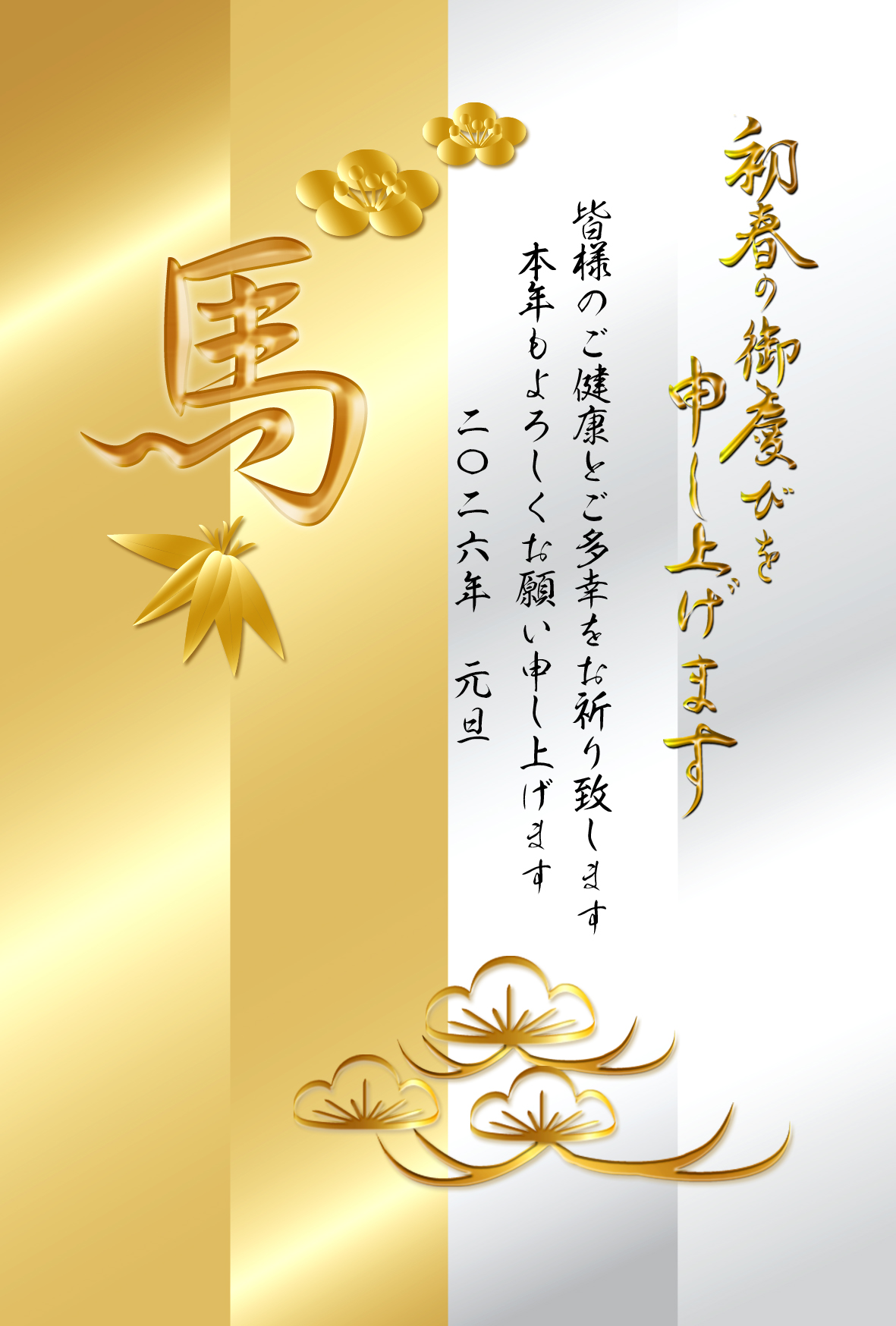 屏風風に分割した背景に松竹梅と「馬」文字を金銀二色でデザイン。和を感じる雰囲気の綺麗なイラストでレイアウトしたオシャレなテンプレートを無料ダウンロード。2026年(令和8年・午年・馬)和風・和モダン年賀状のデザイン素材。個人・法人問わず会員登録不要で、パソコンでもスマホでも年賀状が作れる印刷用フリー素材です。どの画像編集・年賀状作成アプリ(Word・ペイント・Illustrator・筆まめ)にも対応のJPEG形式。