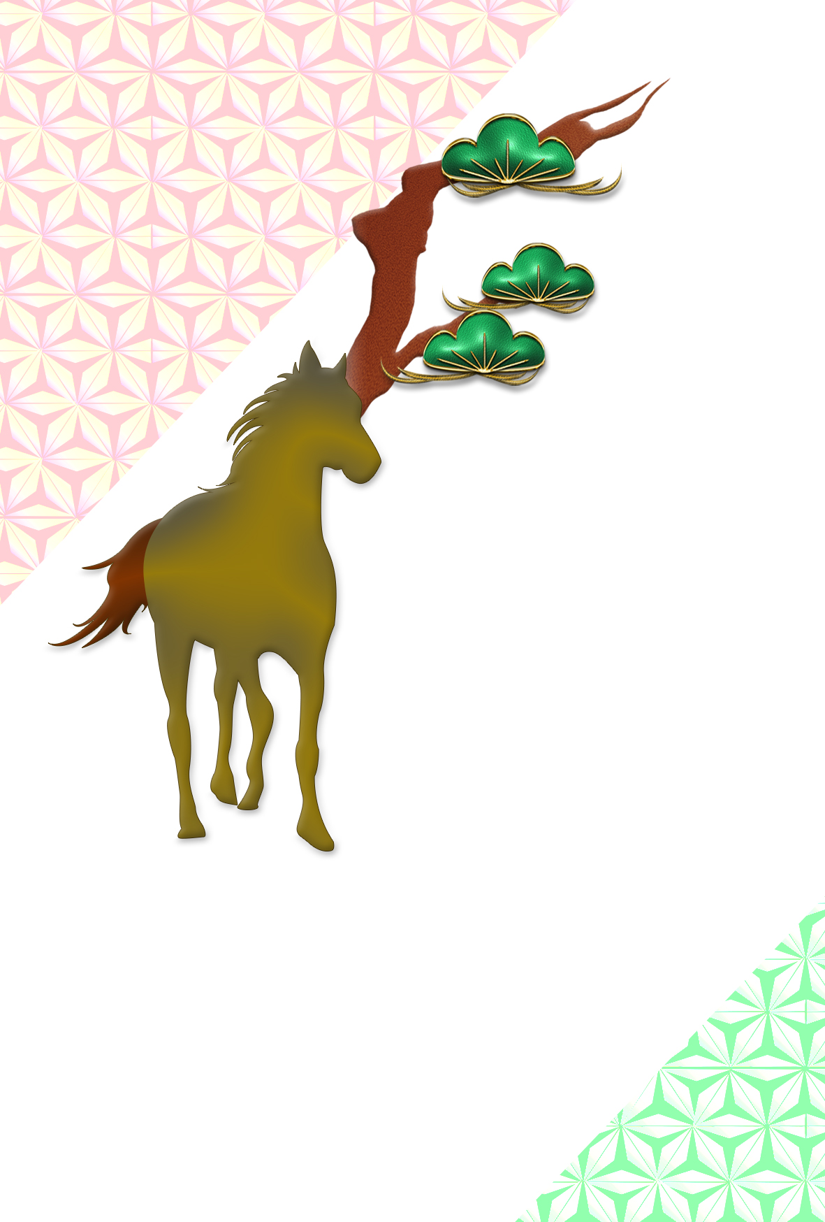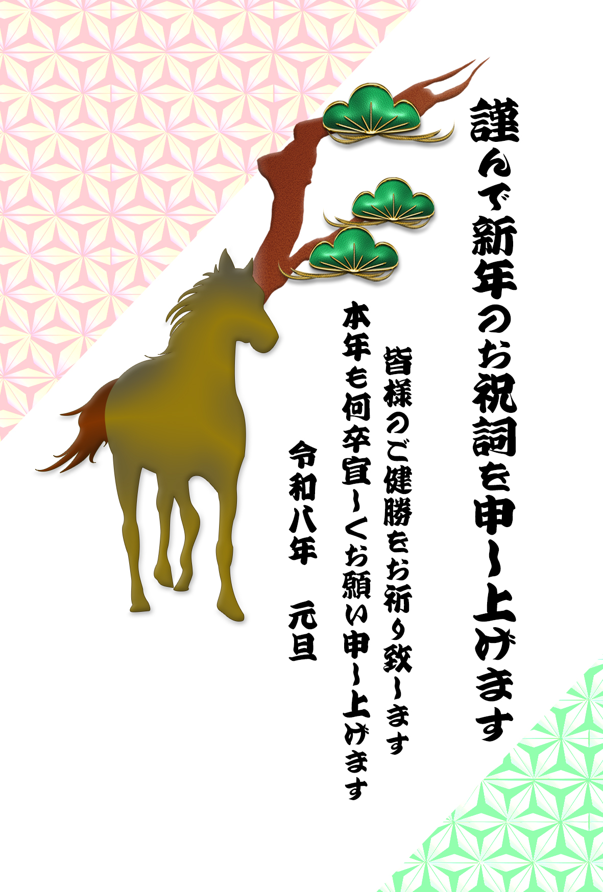松の枝と麻の葉模様、馬のシルエットでデザインした渋い年賀状。和を感じる雰囲気の綺麗なイラストでレイアウトしたオシャレなテンプレートを無料ダウンロード。2026年(令和8年・午年・馬)和風・和モダン年賀状のデザイン素材。個人・法人問わず会員登録不要で、パソコンでもスマホでも年賀状が作れる印刷用フリー素材です。どの画像編集・年賀状作成アプリ(Word・ペイント・Illustrator・筆まめ)にも対応のJPEG形式。