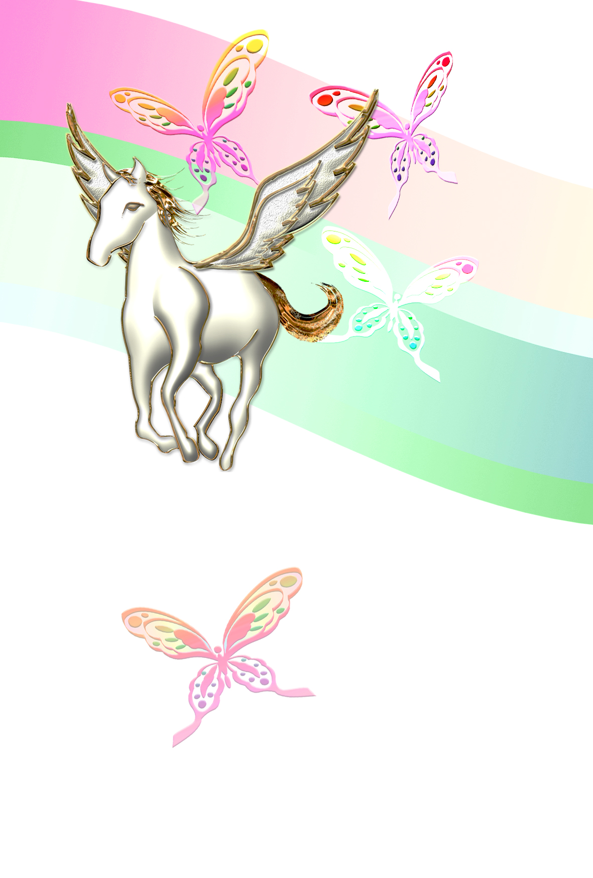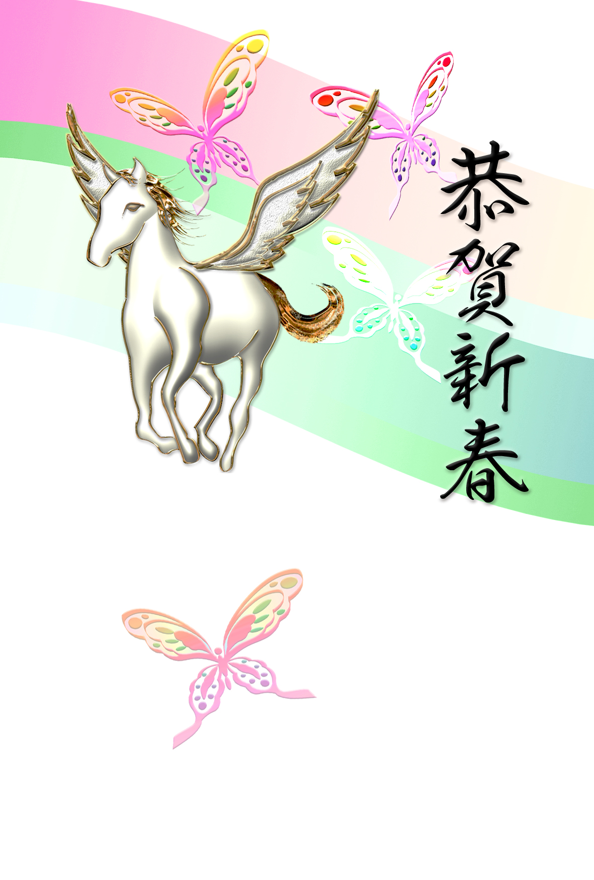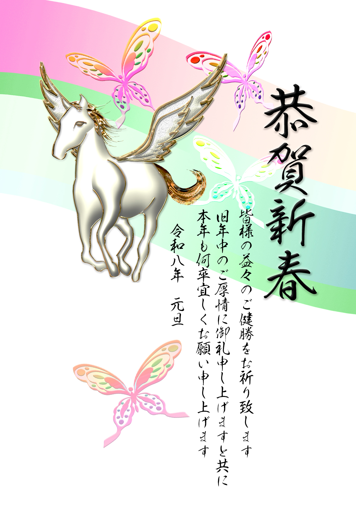 空を飛ぶ天馬のイラストと舞う蝶のデザイン。和を感じる雰囲気の綺麗なイラストでレイアウトしたオシャレなテンプレートを無料ダウンロード。2026年(令和8年・午年・馬)和風・和モダン年賀状のデザイン素材。個人・法人問わず会員登録不要で、パソコンでもスマホでも年賀状が作れる印刷用フリー素材です。どの画像編集・年賀状作成アプリ(Word・ペイント・Illustrator・筆まめ)にも対応のJPEG形式。