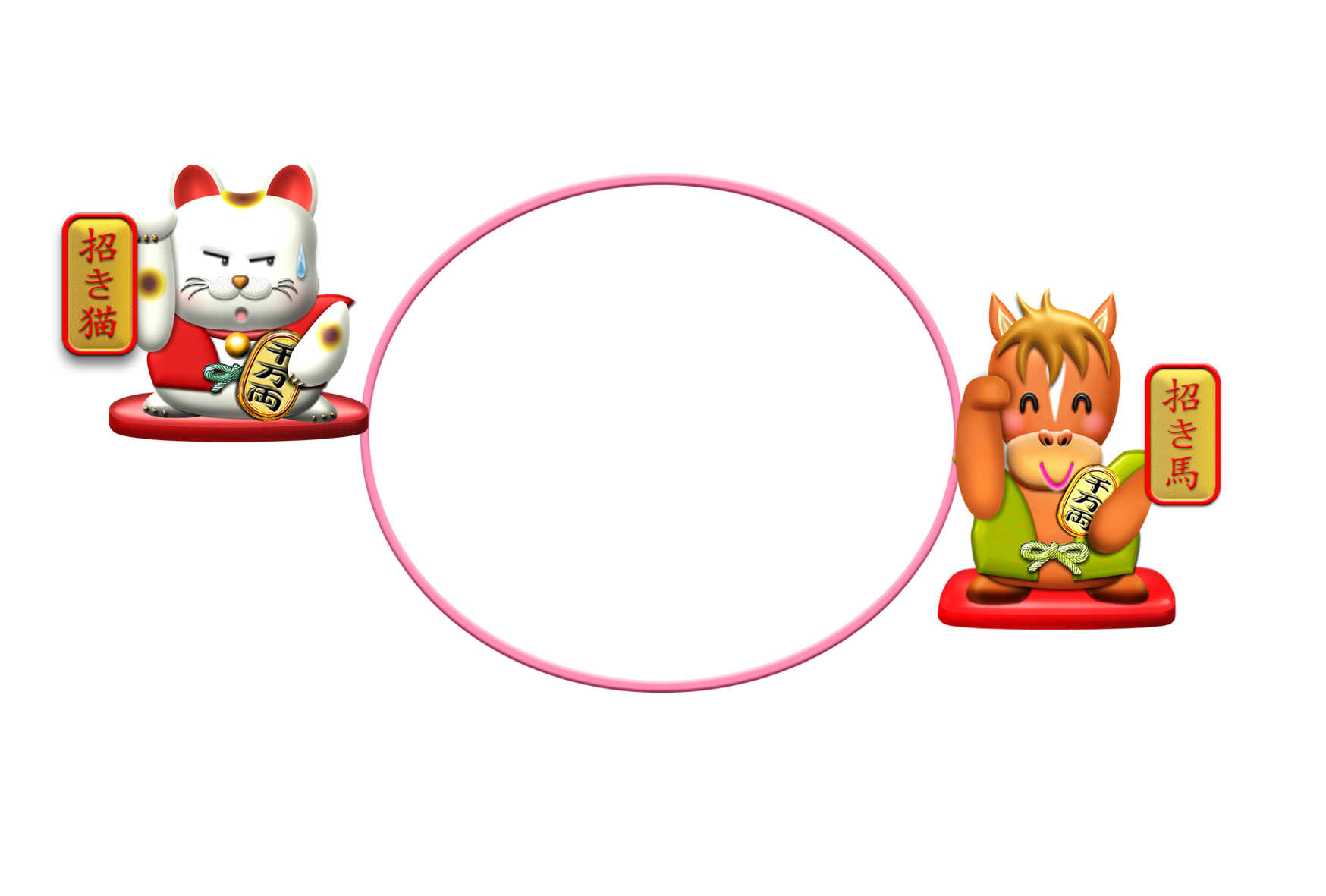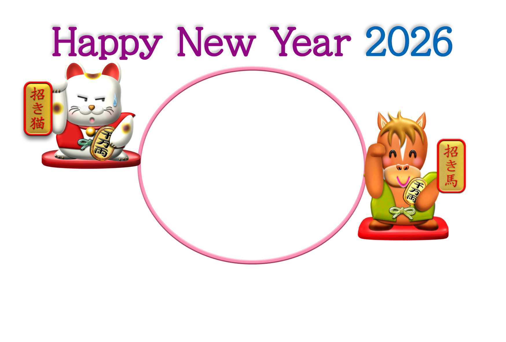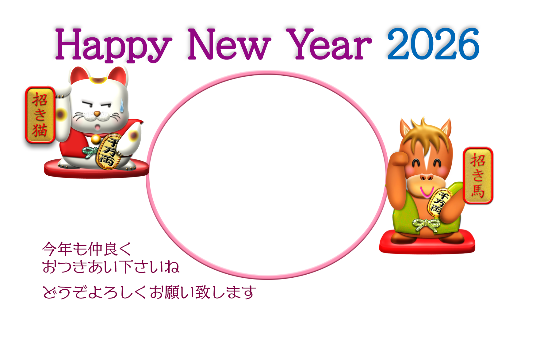 干支が福を招く招き馬と招き猫のフォト年賀状1。横向き。オシャレな写真フレーム付き年賀状テンプレートを無料ダウンロード。2026年(令和8年・午年・馬)年賀状フォトフレームのデザイン素材。個人・法人問わず会員登録不要で、パソコンでもスマホでも年賀状が作れる印刷用フリー素材です。どの画像編集・年賀状作成アプリ(Word・ペイント・Illustrator・筆まめ)にも対応のPNG形式。