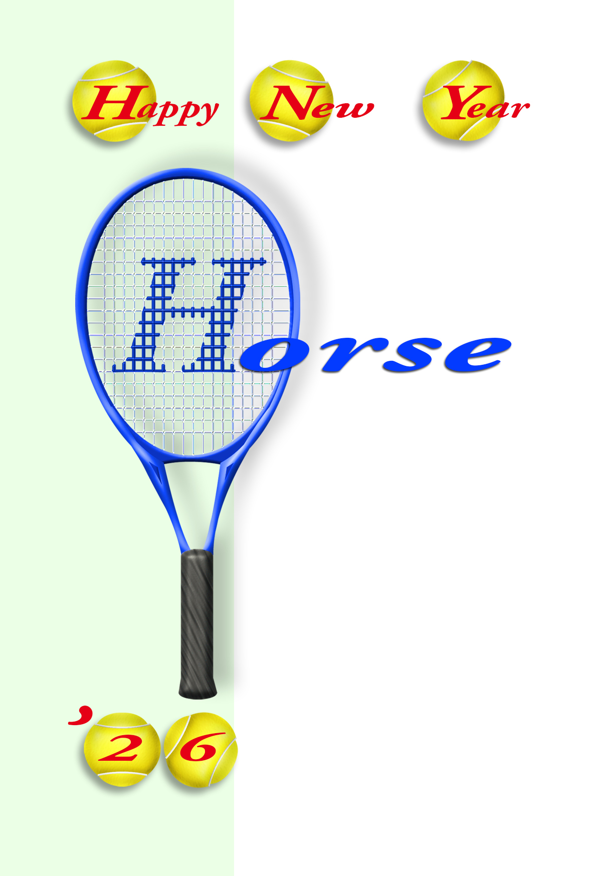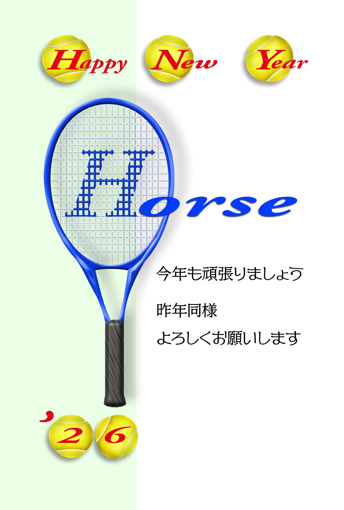 Horseの頭文字をガットにペイントした青いテニスラケットのスタイリッシュでカッコいい年賀状テンプレートを無料ダウンロード。2026年(令和8年・午年・馬)オシャレな年賀状のデザイン素材。個人・法人問わず会員登録不要で、パソコンでもスマホでも年賀状が作れる印刷用フリー素材です。どの画像編集・年賀状作成アプリ(Word・ペイント・Illustrator・筆まめ)にも対応のJPEG形式。
