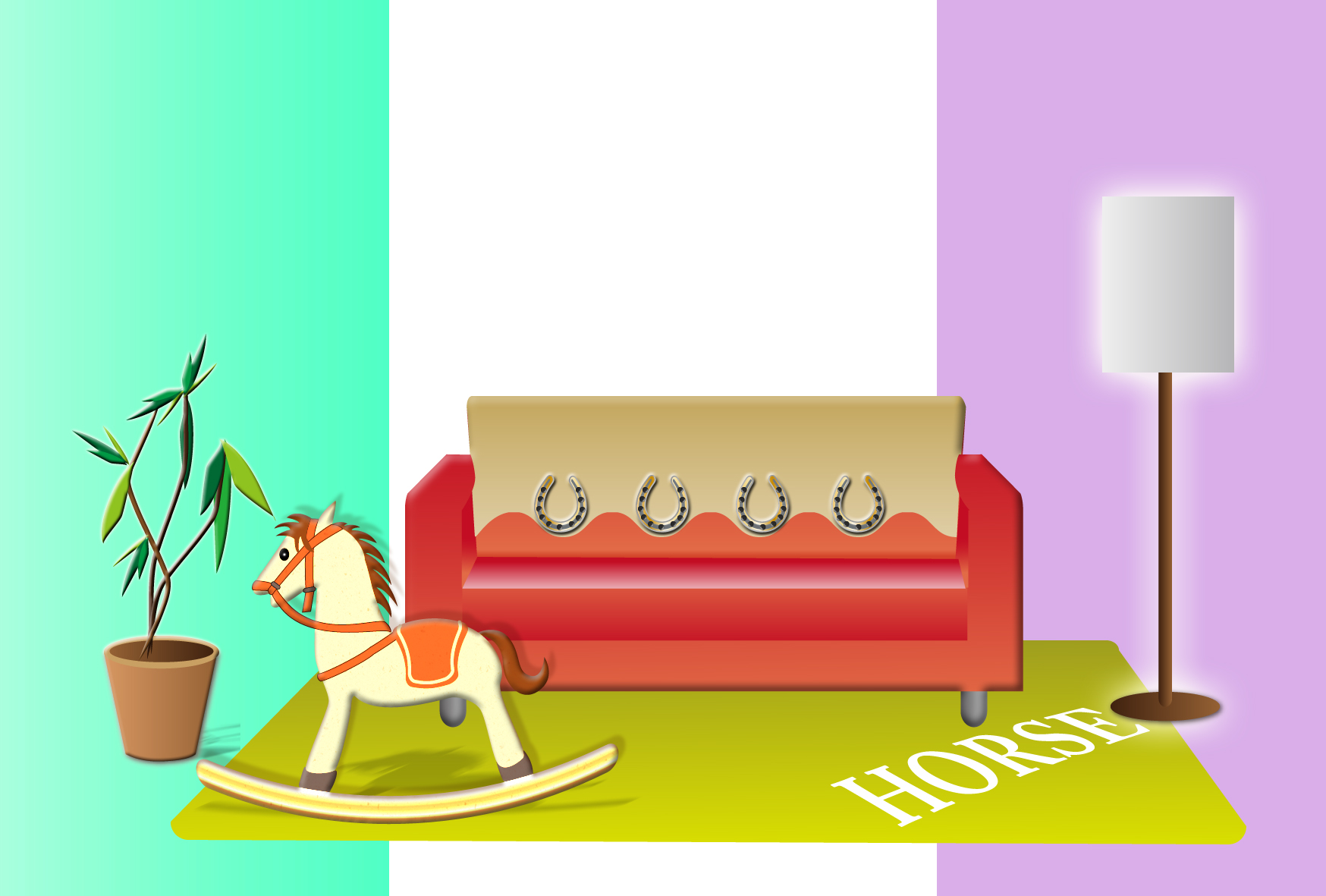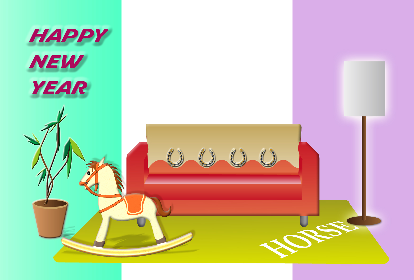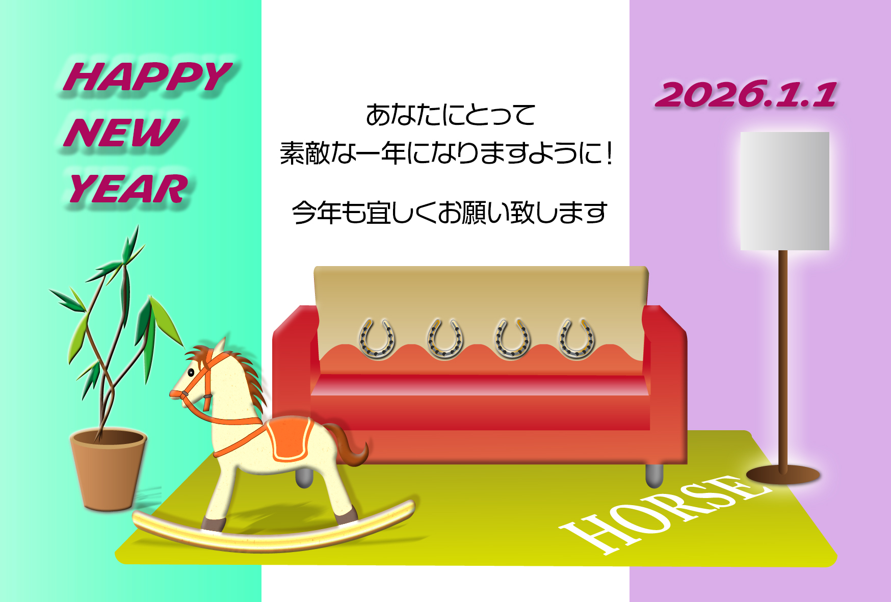 干支の馬でコーディネートしたリビングルームのデザイン。横向き。スタイリッシュでカッコいい年賀状テンプレートを無料ダウンロード。2026年(令和8年・午年・馬)オシャレな年賀状のデザイン素材。個人・法人問わず会員登録不要で、パソコンでもスマホでも年賀状が作れる印刷用フリー素材です。どの画像編集・年賀状作成アプリ(Word・ペイント・Illustrator・筆まめ)にも対応のJPEG形式。